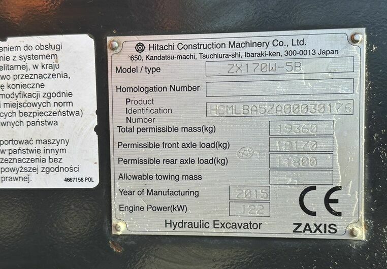 KOPARKA KOŁOWA MARKI HITACHI ZX 170W-5BNUMER VIN: HCMLBA5ZA00030176