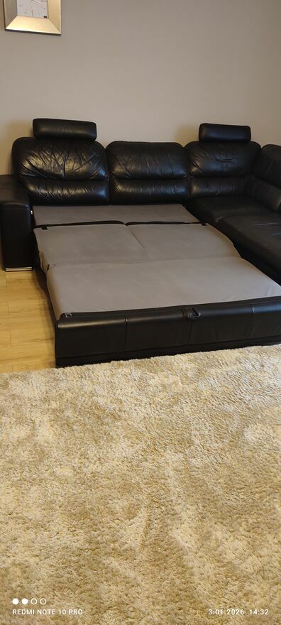 Sprzedam skórzany narożnik z funkcją spania, narożnik posiada skrzynię na pościel.Cena 1500 do negocjacji